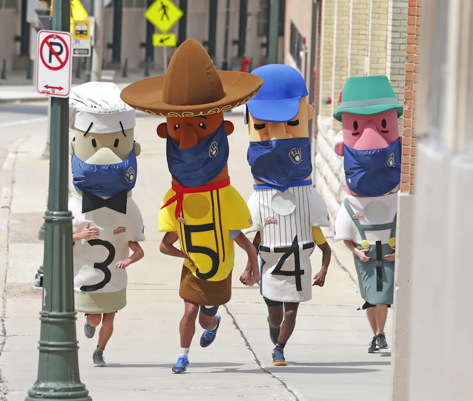 The Milwaukee Brewers Racing Sausages run through the Molson Coors campus in Milwaukee on July 27, 2020.