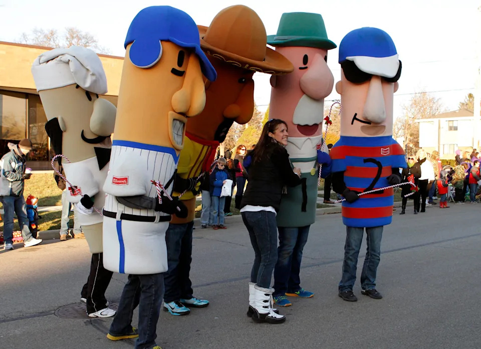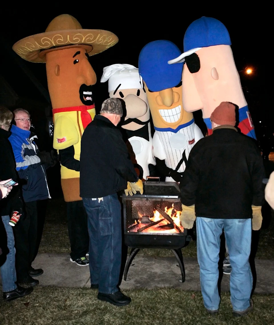 The Brewers Racing Sausages took a break during the 32nd annual Burlington Christmas Parade on Dec. 6, 2013, to warm up in the front yard of a house along the parade route.