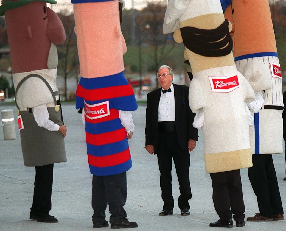 Dick Steinmetz is greeted by the Klement’s Sausages as he enters the seventh annual Whitefish Bay Public Education Foundation Bay Ball held at Miller Park on Oct. 20, 2001, in Milwaukee.