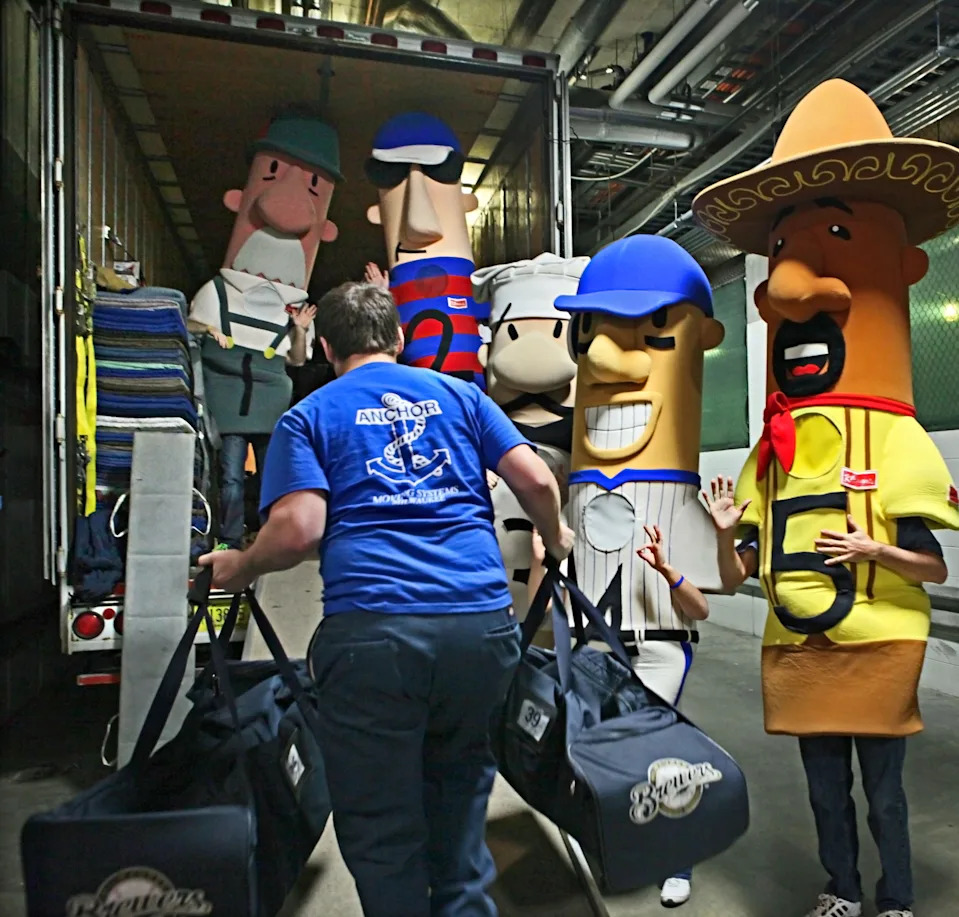 Workers from Anchor Moving Systems in Milwaukee were greeted by the Brewers Racing Sausages on Jan. 18, 2013, as they loaded the truck at Miller Park for the trip to Milwaukee Brewers spring training.
