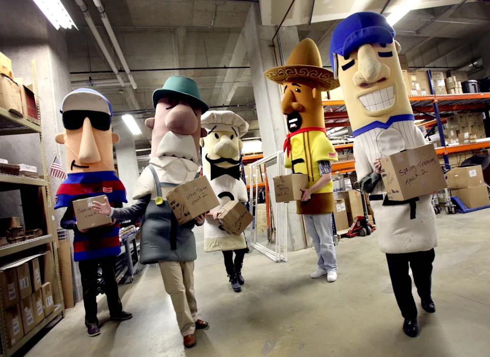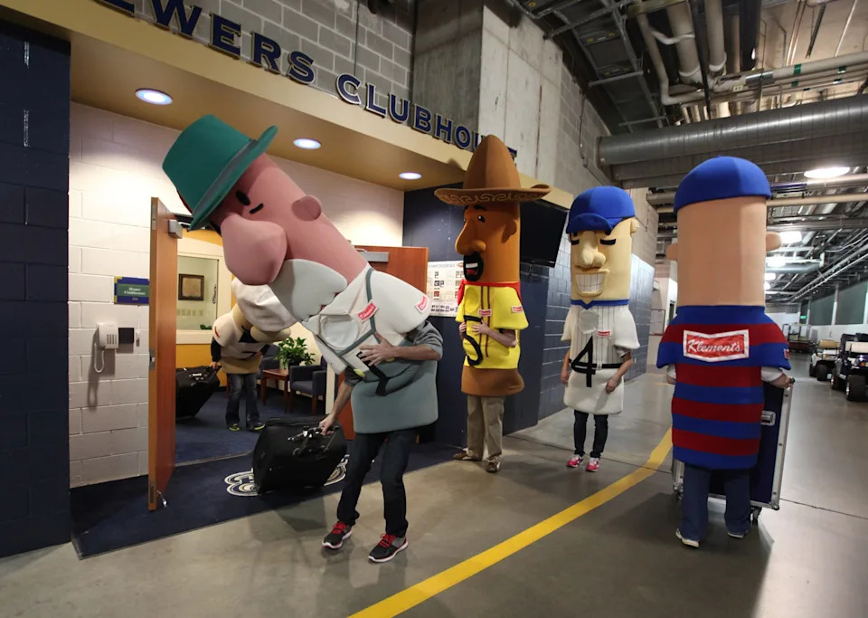 The Brewers Racing Sausages help pack for their trip to Arizona for spring training on Feb. 8, 2011.