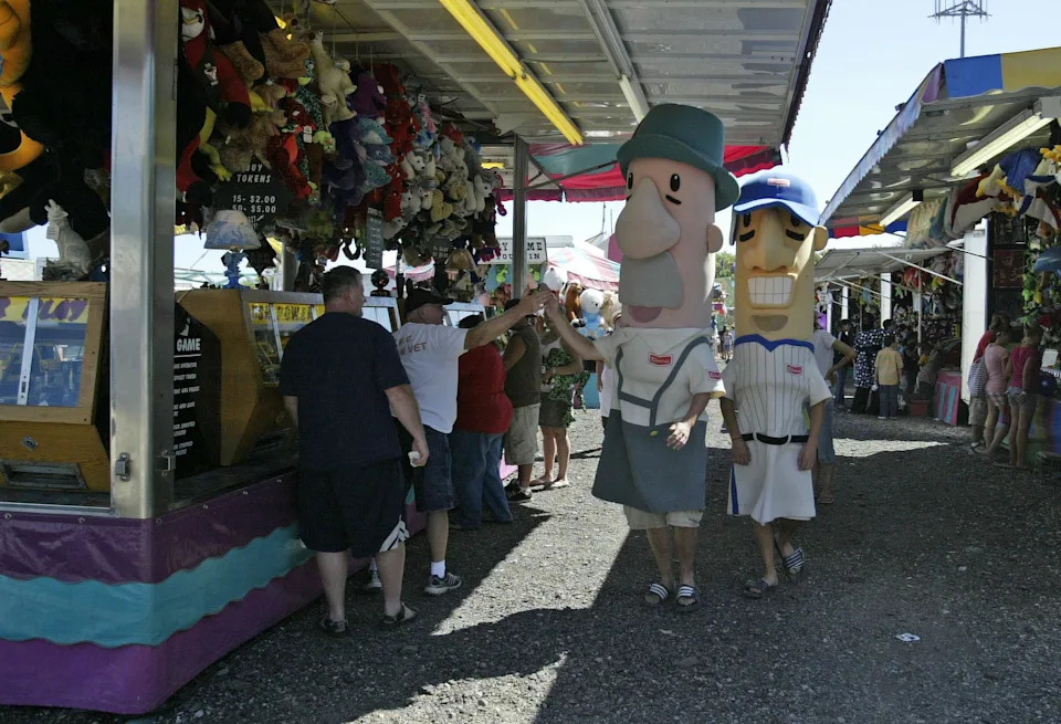 Milwaukee Brewers Racing Sausages, the Bratwurst and Hot Dog greet people along the midway of Oak Creek’s Lionsfest on Aug. 30, 2008.