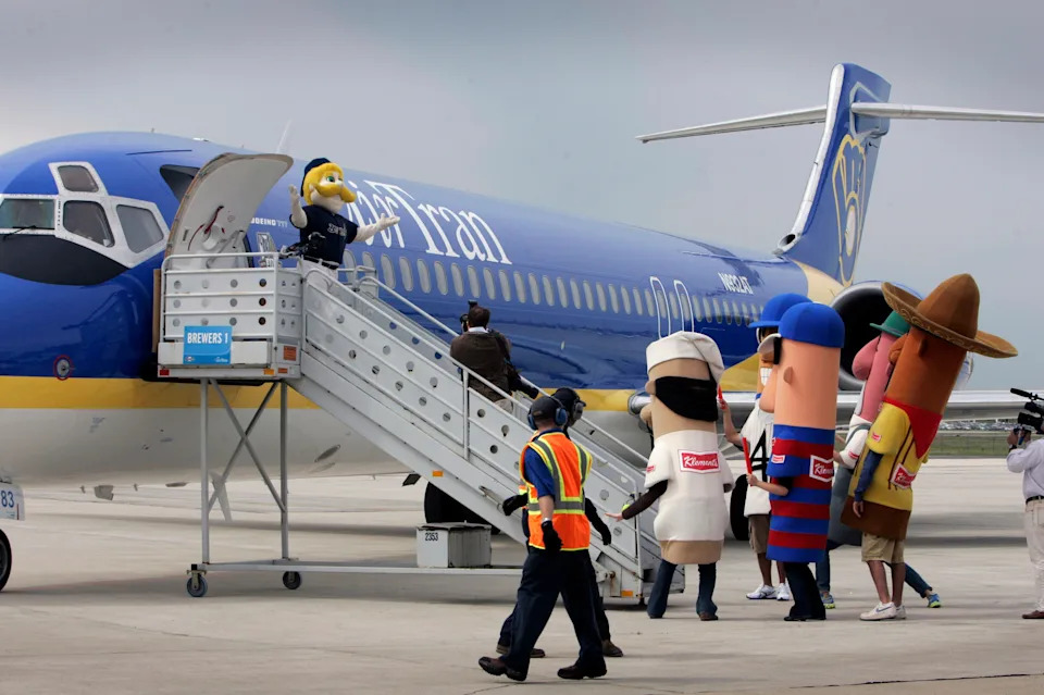 The Milwaukee Brewers Racing Sausages greet Bernie Brewer as he exits the new “Brewers 1”, Air Tran Airways Boeing 717 airplane on May 17, 2010. Kids from the YMCA of Metropolitan Milwaukee pulled the 120,000 pound aircraft 20 feet to earn a $50,000 check for their summer camp program from Air Tran.