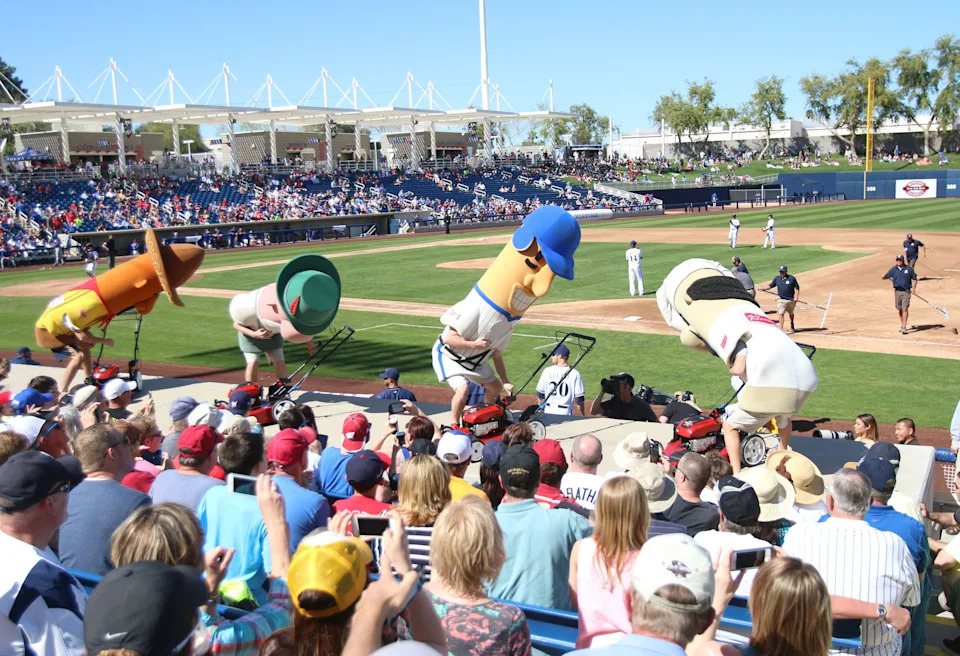 The Racing Sausages help out with a Briggs & Stratton promotion during a break in the Brewers games against the Texas Rangers on March 7, 2015, in Phoenix. Arizona.