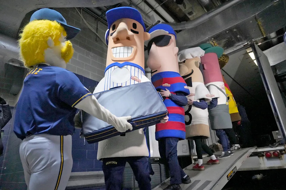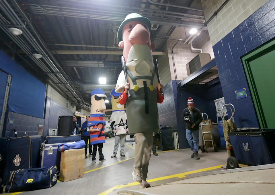 The racing sausages help load baseball gear on Feb. 13, 2019, from the clubhouse to a waiting semi-trailer at Miller Park as the Brewers head to Arizona for spring training.