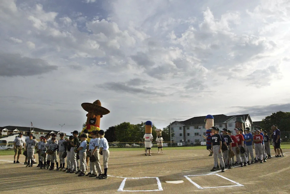 Members of the Cudahy St. Francis Little League Baseball All-Star teams line up for introductions along with the Milwaukee Brewers Racing Sausages before their game on June 21, 2007.