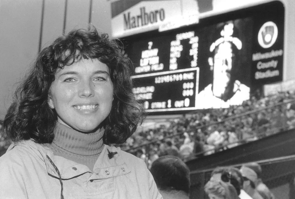 Scoreboard animator Karen Johnson of Racine visits County Stadium where her cartoon creations such as a trio of racing sausages entertain thousands of fans at each Brewers game.