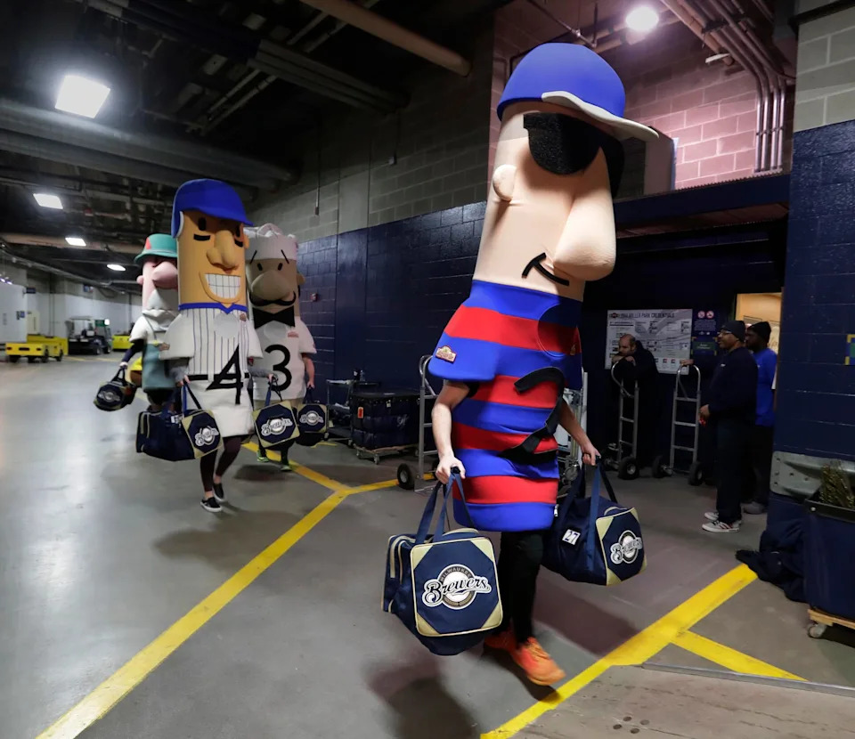 The Brewers Racing Sausages pose for a photo before helping to load the Milwaukee Brewers team equipment truck at American Family Field in Milwaukee on Feb. 4, 2025, before heading to Phoenix, Ariz. for spring training.