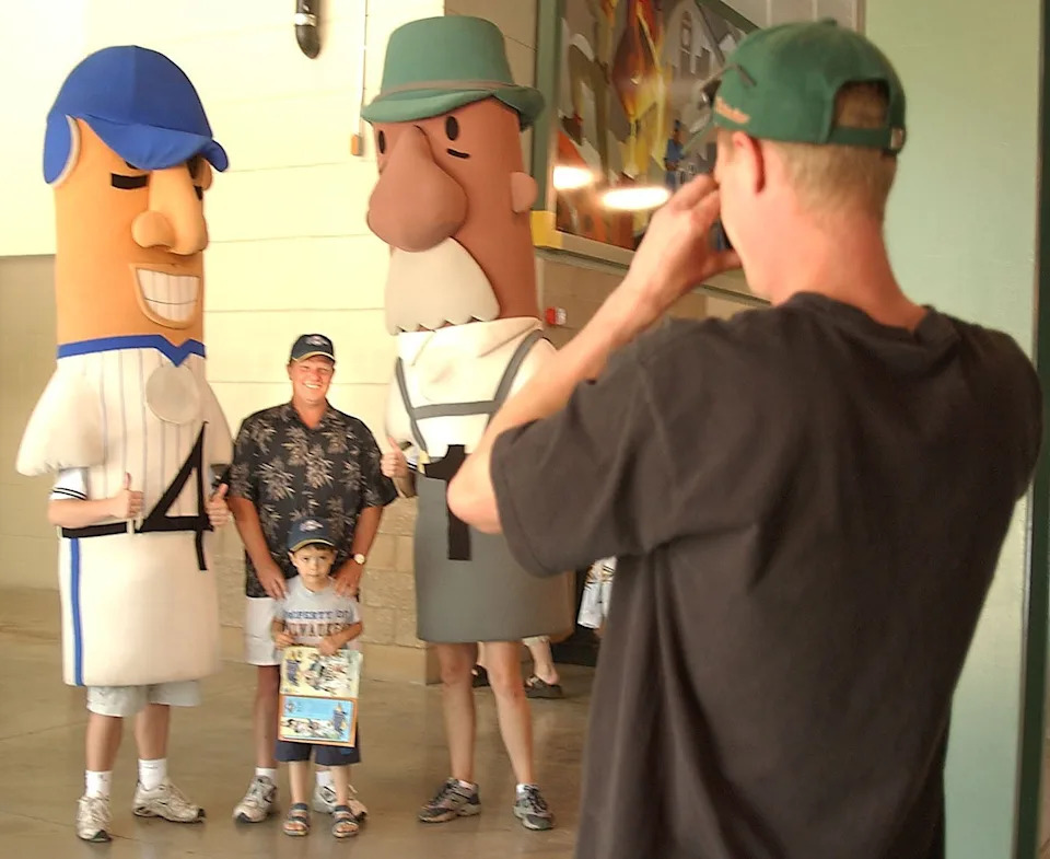 James Weeden from Palatine, Ill, poses with his grandson James Weeden, 4, while father, James Weeden, from Mundelein, Ill, photographs the two with the Milwaukee Brewers Racing Sausages before the game on June 16, 2002, at Miller Park. The family is originally from Grafton and attends 4-6 games each year.
