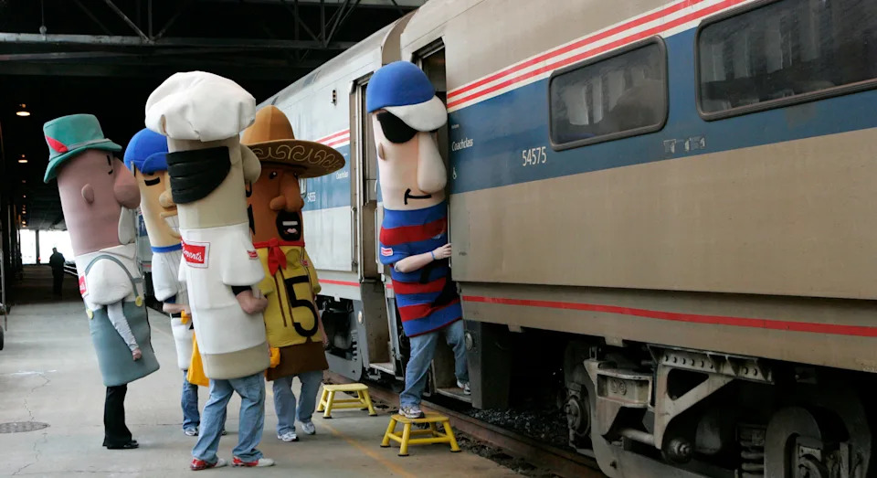 The Milwaukee Brewers Racing Sausages prepare to board an Hiawatha Amtrak train at Milwaukee’s Intermodal station on Feb. 12, 2009, as part of a special promotion promoting trips to Chicago for Brewers-Cubs games.