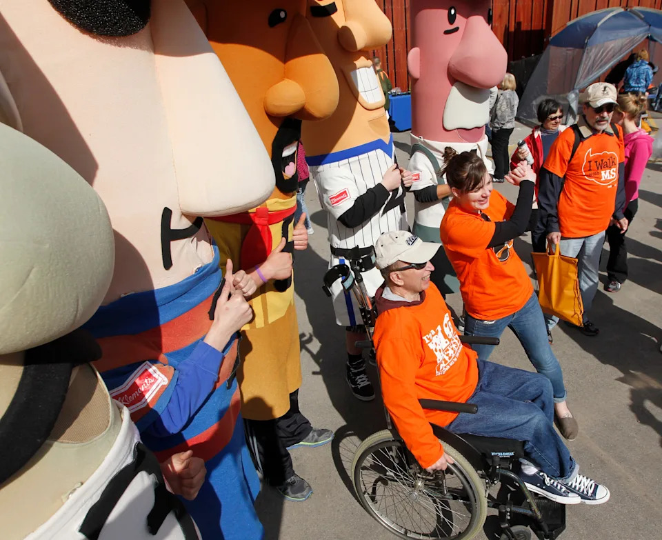 Dennis Teuscher (left) and his niece Jenny Teuscher pose for a photo with the Brewers Racing Sausages before the start of a 3.3 mile on May, 4 2014, at Maier Festival Park in Milwaukee, Wis. to raise money for multiple sclerosis research.