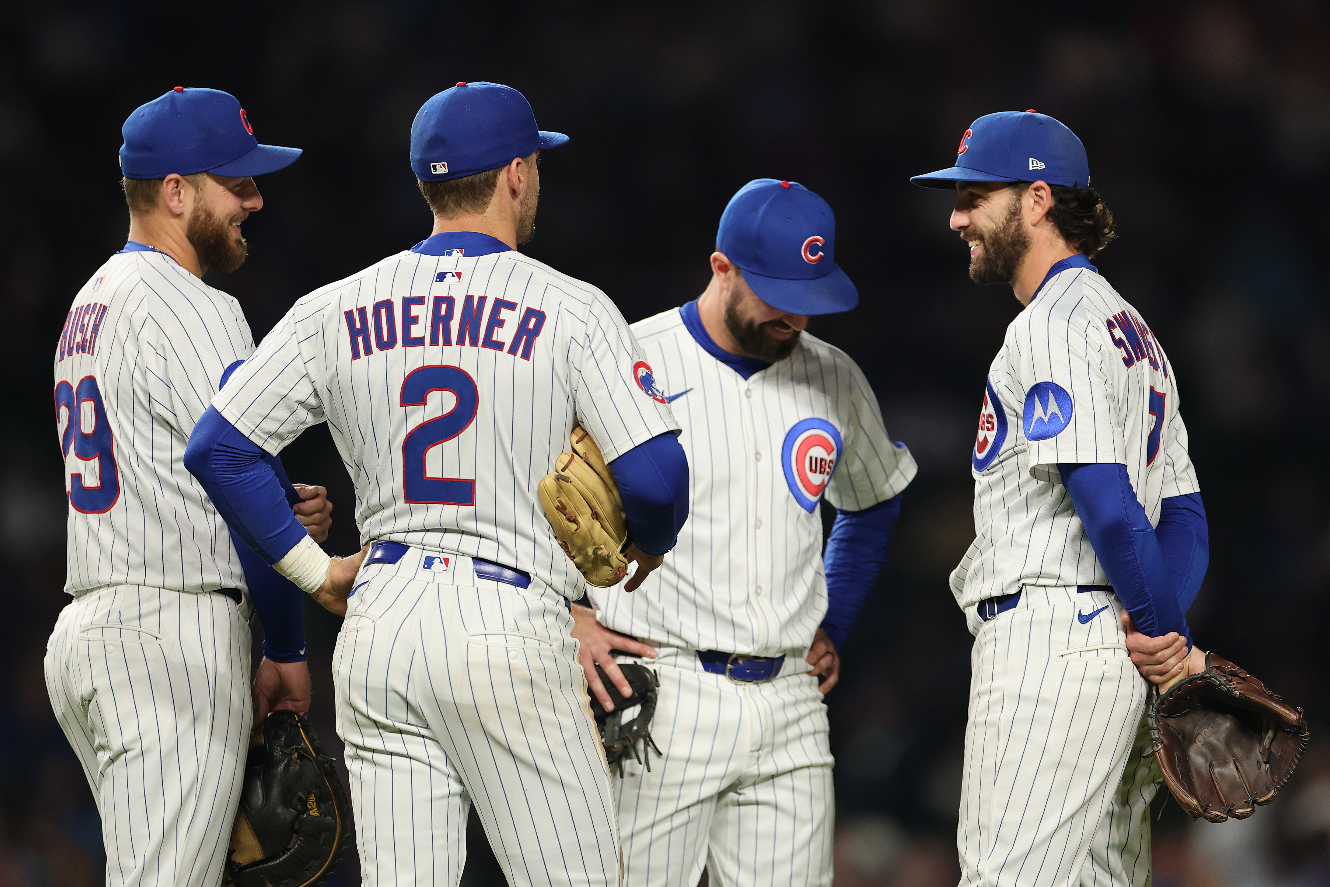 GettyMichael Busch #29, Nico Hoerner #2, Jon Berti #5 and Dansby Swanson #7 of the Chicago Cubs look on against the Miami Marlins at Wrigley Field on May 12, 2025 in Chicago, Illinois.