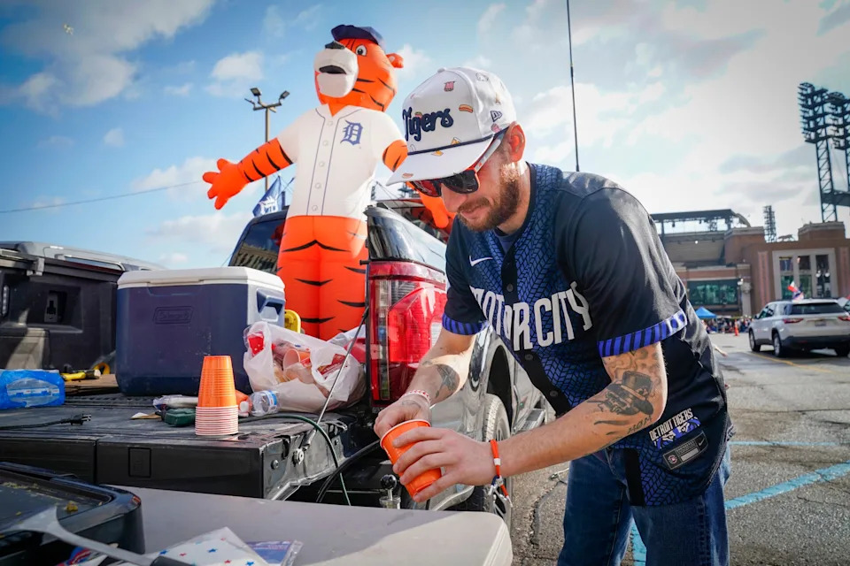 With an inflated tiger in the background Matthew Suisse, 36, of Waterford fills a cup with Leinenkugel Summer Shandy from a keg for a friend before the Detroit Tigers take on the St. Louis Cardinals for opening day at Comerica Park in Detroit on Friday, April 3, 2026