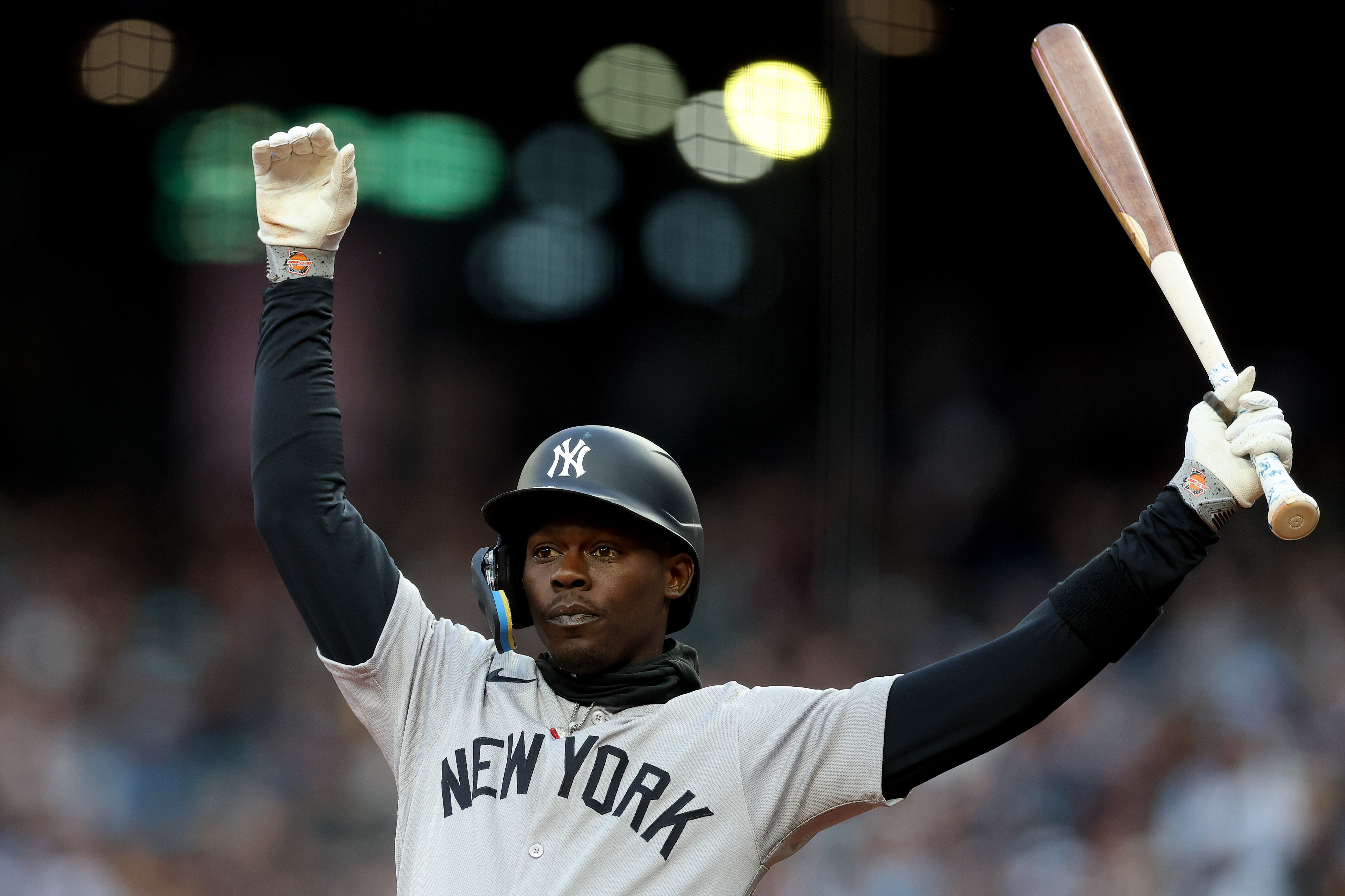 GettyJazz Chisholm Jr. #13 of the New York Yankees looks on during the seventh inning against the Toronto Blue Jays in game four of the American League Division Series at Yankee Stadium on October 08, 2025 in New York City.