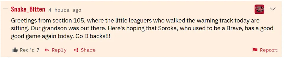It was a pretty quiet Gameday Thread today, which is understandable given how the first two games of this series went, and also that the NCAA Final Four was underway while the game was going on. At time of writing, we’re looking at 126 comments. A number went Sedona Red (or what passes for it these days), because we were apparently feeling generous with our rec’s today. By popular acclaim, this one goes to Snake_Bitten, who was not present in the Thread but was doing their part by being at the game in person, and also invoking the grace of the baseball gods to ensure Soroka’s success against his former team: