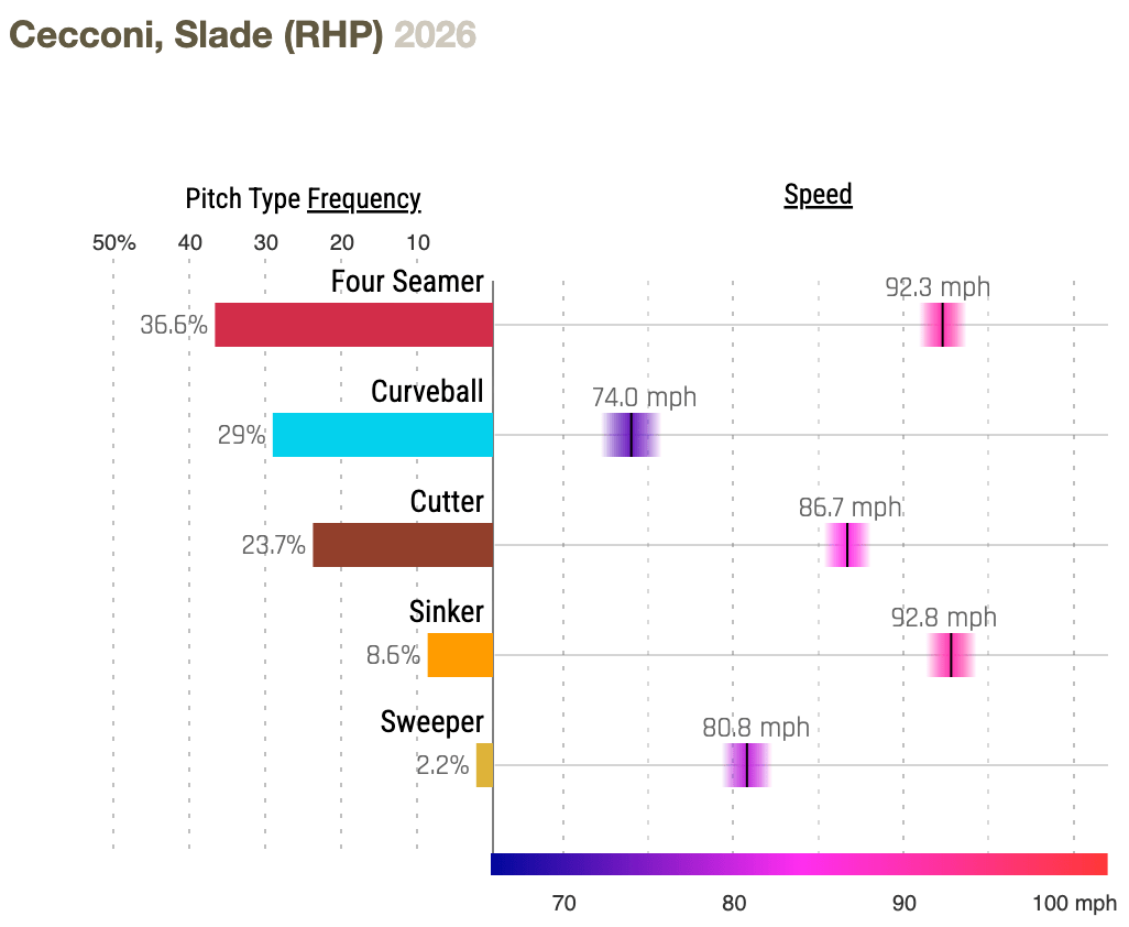 Slade Cecconi got torched by the Mariners in his first 2026 start last Sunday in Seattle — 4.1 innings, six runs allowed. He threw 93 pitches and, as noted, did not finish the fifth inning.