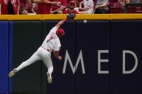 Cincinnati Reds right fielder Spencer Steer leaps for a double hit by Pittsburgh Pirates’ Nick Gonzales during the seventh inning of a baseball game in Cincinnati, Wednesday, April 1, 2026. Carolyn Kaster — AP