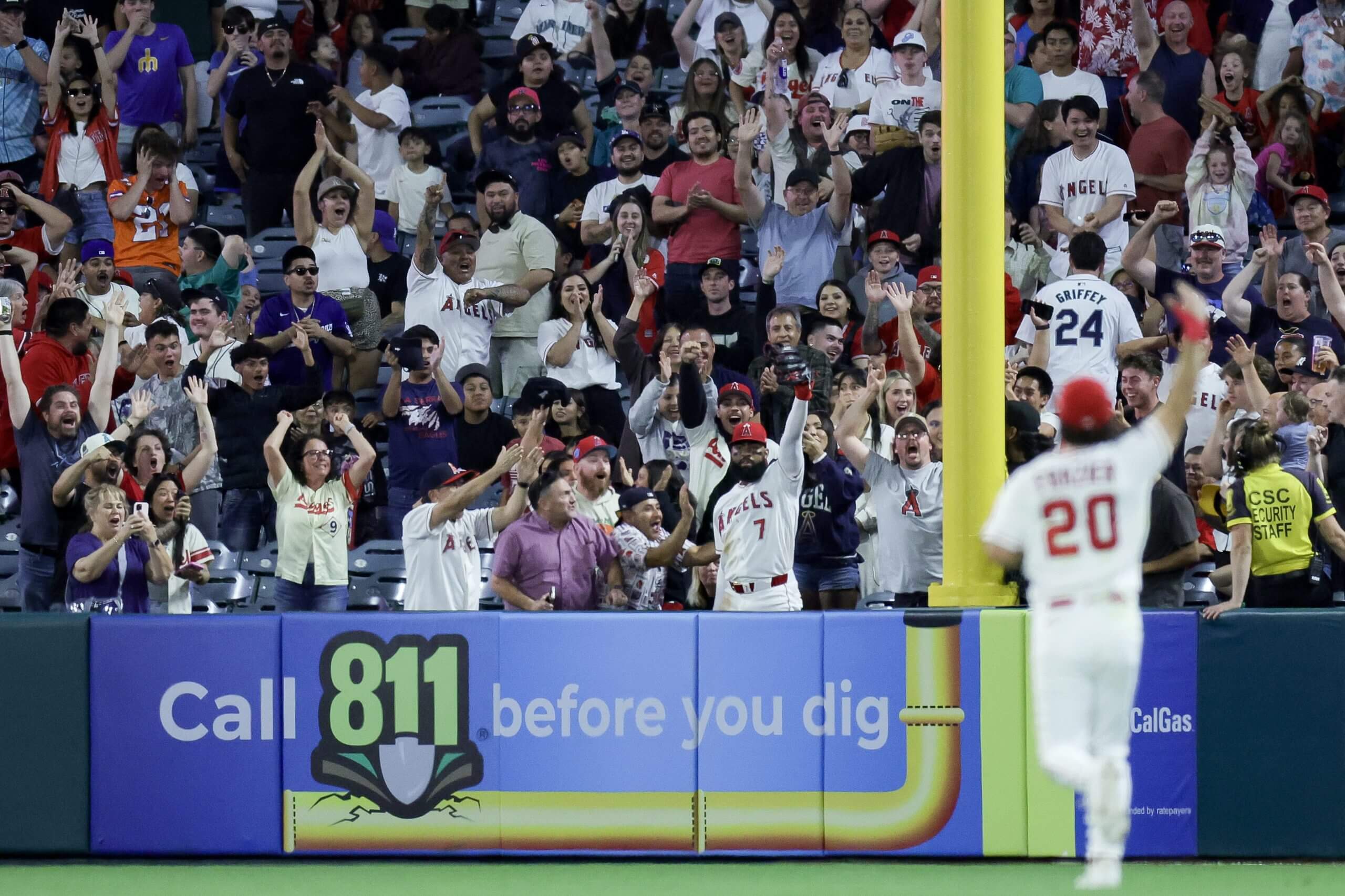 ANAHEIM, Calif. — There was a brief moment of silence amid the chaos Saturday night. The Los Angeles Angels’ Jo Adell had just toppled over the short wall in right field. It looked like he’d made another home run robbery — his third of the evening. But he’d also disappeared from view.