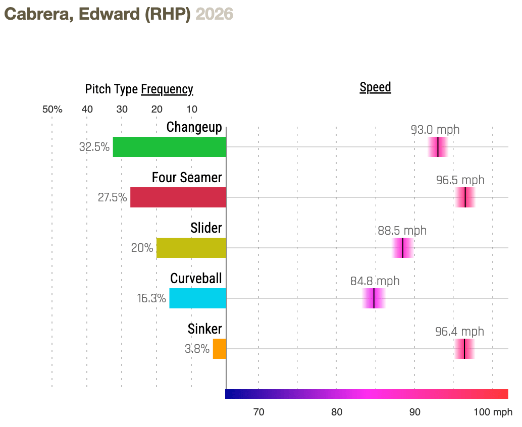Cabrera was nails in his first 2026 start last Monday against the Angels, allowing just one hit and one walk, striking out five.