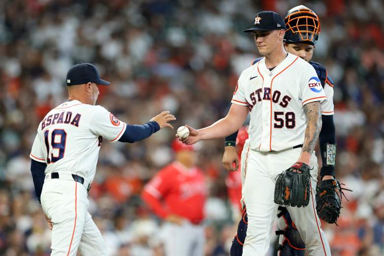 GettyHOUSTON, TEXAS – MARCH 26: Manager Joe Espada #19 of the Houston Astros takes the ball from Hunter Brown #58 in the fifth inning against the Los Angeles Angels on Opening Day at Daikin Park on March 26, 2026 in Houston, Texas. (Photo by Tim Warner/Getty Images)