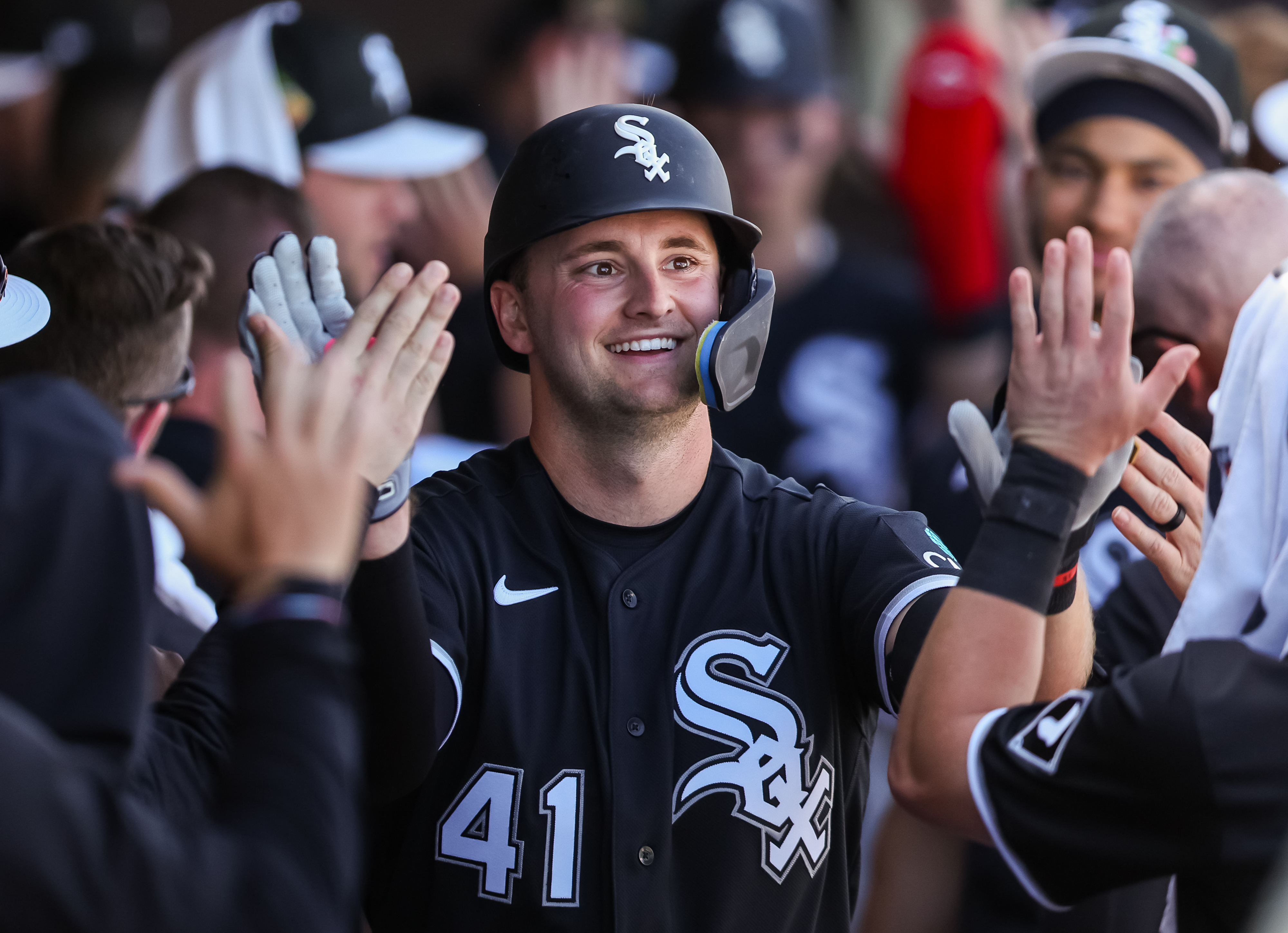 GettyTanner Murray #41 of the Chicago White Sox high fives with teammates after his second-inning home run against the Seattle Mariners during their spring training game at Peoria Stadium on February 24, 2026 in Peoria, Arizona.