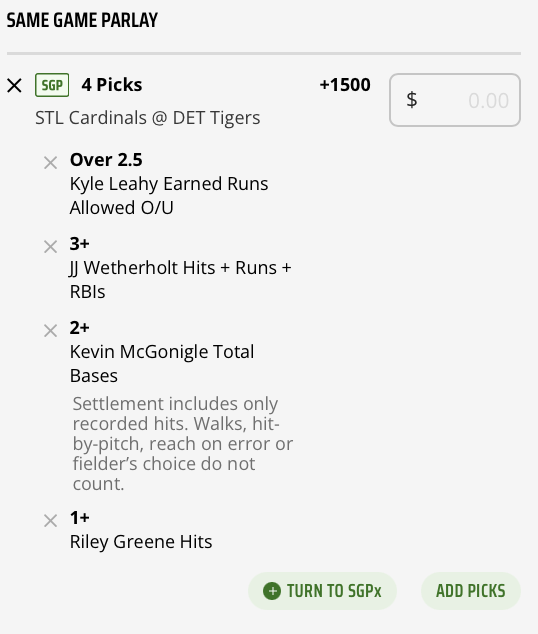 If you’re building a Same-Game Parlay (SGP) for Sunday Night Baseball, you can add in Greene getting a hit to boost the odds of the four Cardinals-Tigers props in this post up to +1500.