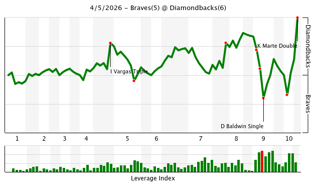 The D-backs blew leads of 3-1, 4-3 and 5-4, but managed to prevail in the bottom of the tenth inning. Ketel Marte swatted the first pitch he saw over the head of the Atlanta right-fielder, driving in Manfred Man Jorge Barrosa from second for our first walk-off win of the year. That gave them a split of the four games against the Braves, despite being outscored 25-10 overall. It also returned the team to .500, and Arizona now gets a day off tomorrow, to rest before a tough upcoming road-trip to the East coast.