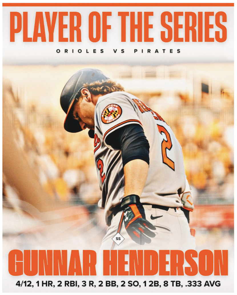 Shane Baz allowed no earned runs in his second Oriole start. Pittsburgh left 11 batters on base and hit 2-for-10 with runners in scoring position during the game. Seven of the nine members of Baltimore’s starting lineup reached base in the game.