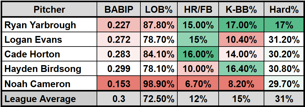 I thought it might be helpful for us to look at this set of stats for the entire group of pitchers, all in one spot. I call these the “red flag stats” because they are some of the first ones I examine when trying to figure out why a pitcher’s surface-level stats (such as ERA) may differ from their other ERA-indicators.