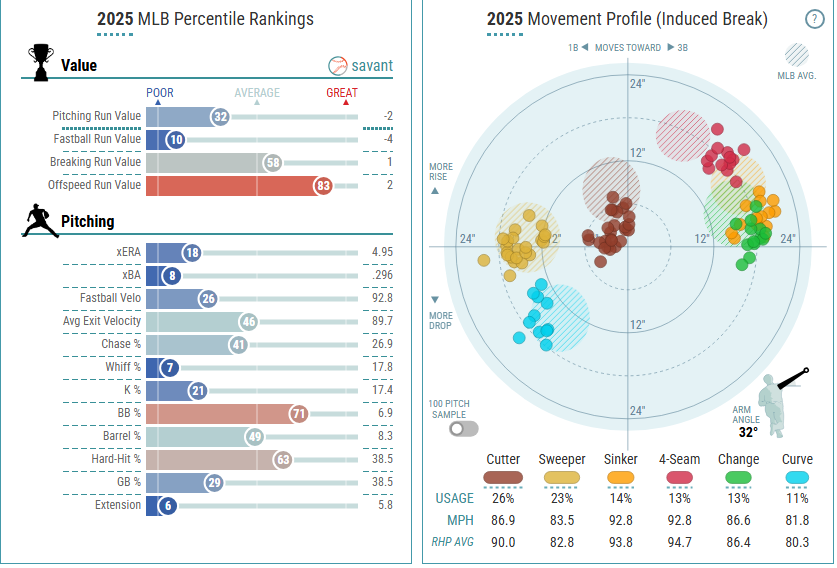 2025 Advanced Stats: 4.43 SIERA, 4.93 xERA, 17.4% K%, 38.1% GB%, 97 Stuff+