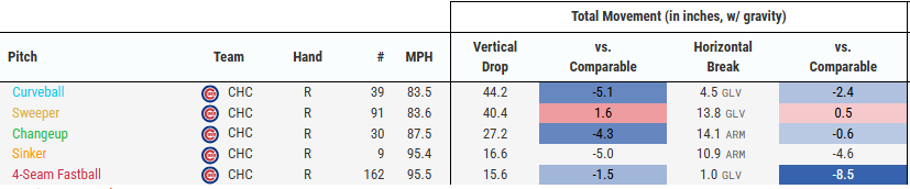 He has a five-pitch arsenal and is leading with his four-seamer at 28%. While I usually support a varied arsenal, I’ll repeat what I did in Logan Evans’ breakdown – more pitches aren’t always better if none of these pitches are all that great.