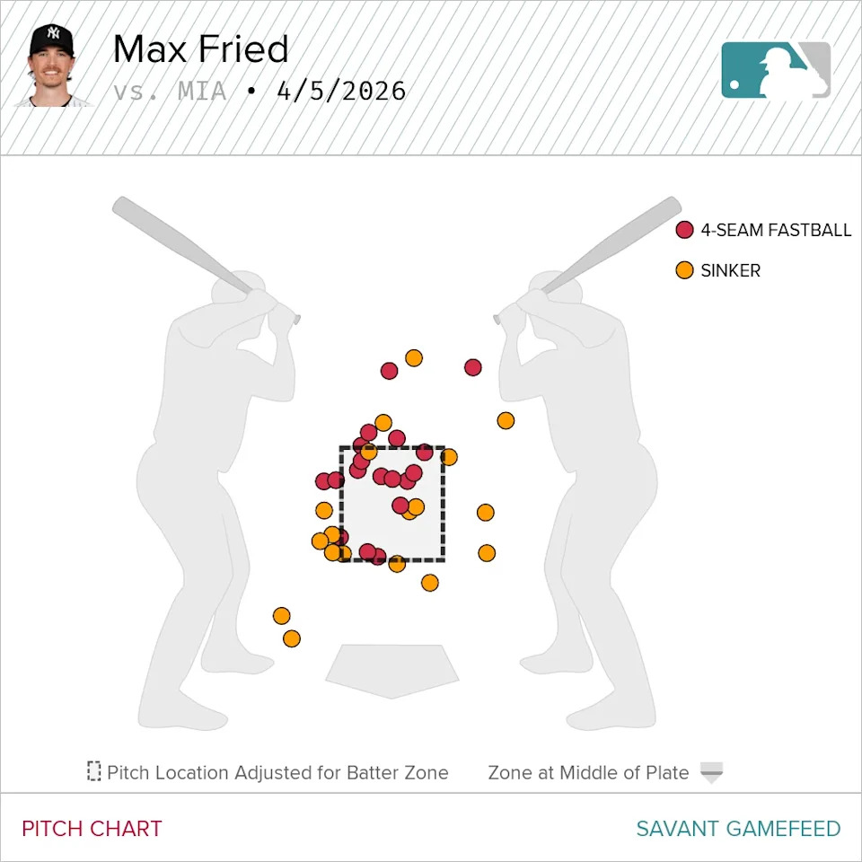 There’s far more easy takes here than we’re used to seeing with Fried, and when he uses his fastball early in counts to set up the four other, more “junky” pitches he uses later in the count, throwing fastballs for balls gets him into 1-0 or 2-1 holes, rather than spotting himself an early strike. We then are left with hitters in hitters’ counts and throwing more pitches than we’d like to see.