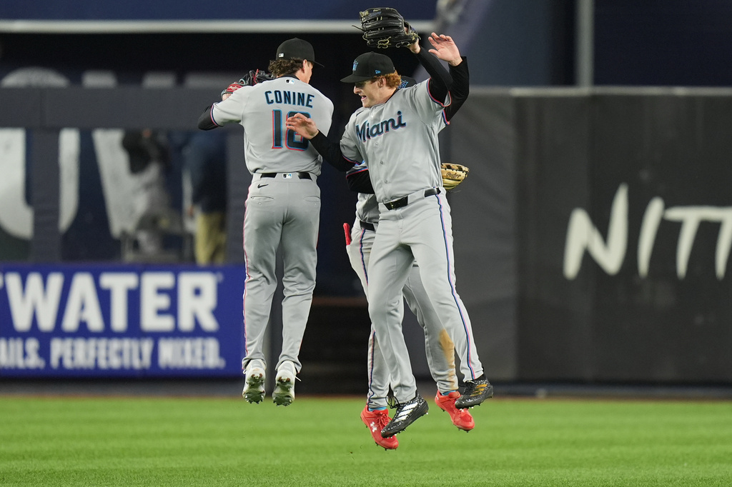 Miami Marlins outfielders Griffin Conine, left, Owen Caissie, right, and Jakob Marsee, behind, celebrate after a baseball game against the New York Yankees, Sunday, April 5, 2026, in New York. (AP Photo/Seth Wenig)