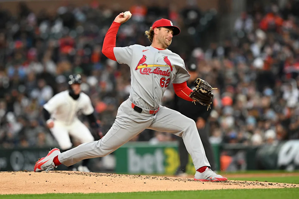 St. Louis Cardinals starting pitcher Kyle Leahy throws a pitch against the Detroit Tigers in the first inning at Comerica Park, Sunday, April 5, 2026.