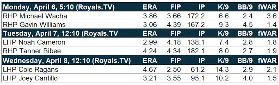 With cold temperatures, two below-average lineups, and two pitching staffs with a track record of success, expect a low-scoring series this week in Ohio. The Royals have had some bullpen issues to start the year that they will need to iron out this week. The Guardians are the defending division champs, and the Royals will need to show they can stand toe-to-toe with them if they are going to seriously compete for a division title this year.