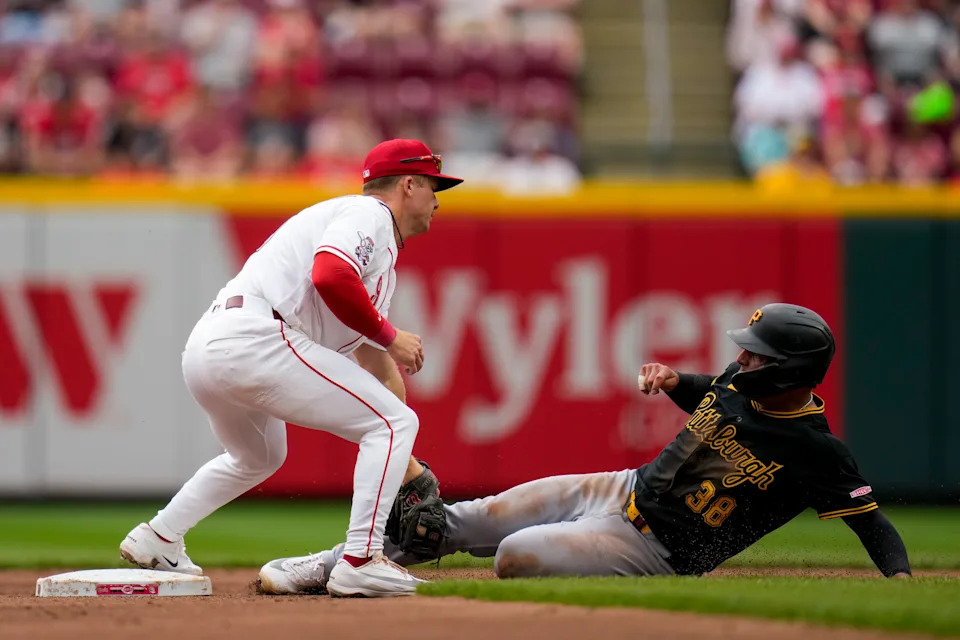 Cincinnati Reds second baseman Matt McLain (9) tags out Pittsburgh Pirates second baseman Nick Yorke (38) to complete a double play in the fourth inning of the MLB National League game between the Cincinnati Reds and the Pittsburgh Pirates at Great American Ball Park in downtown Cincinnati on Wednesday, April 1, 2026.