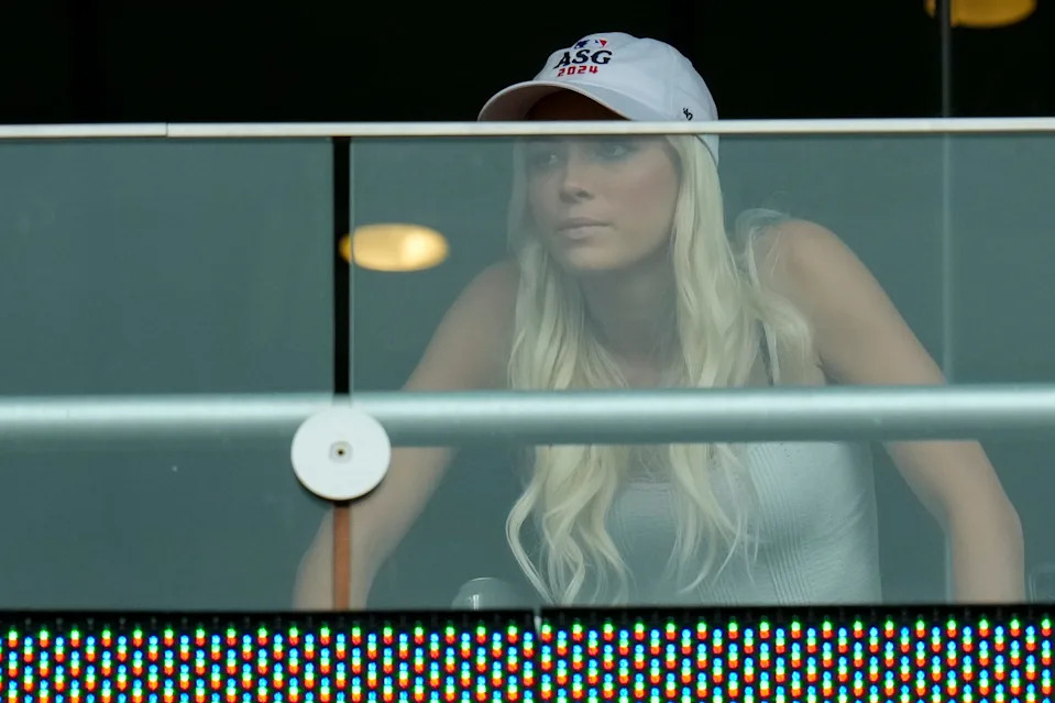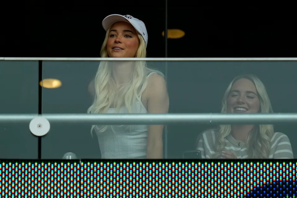 Livvy Dunne cheers on Pittsburgh Pirates pitcher Paul Skenes (30) from the suite level in the first inning of the MLB National League game between the Cincinnati Reds and the Pittsburgh Pirates at Great American Ball Park in downtown Cincinnati on Wednesday, April 1, 2026.