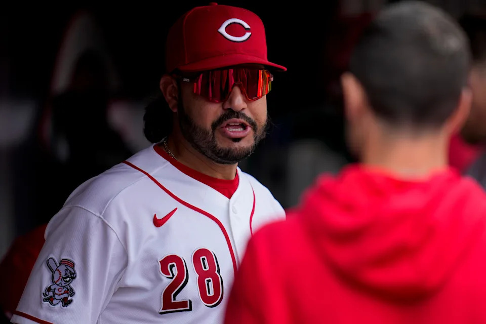 Cincinnati Reds designated hitter Eugenio Suárez (28) walks though the dugout in the eighth inning of the MLB National League game between the Cincinnati Reds and the Pittsburgh Pirates at Great American Ball Park in downtown Cincinnati on Wednesday, April 1, 2026. The Reds lost 8-3.