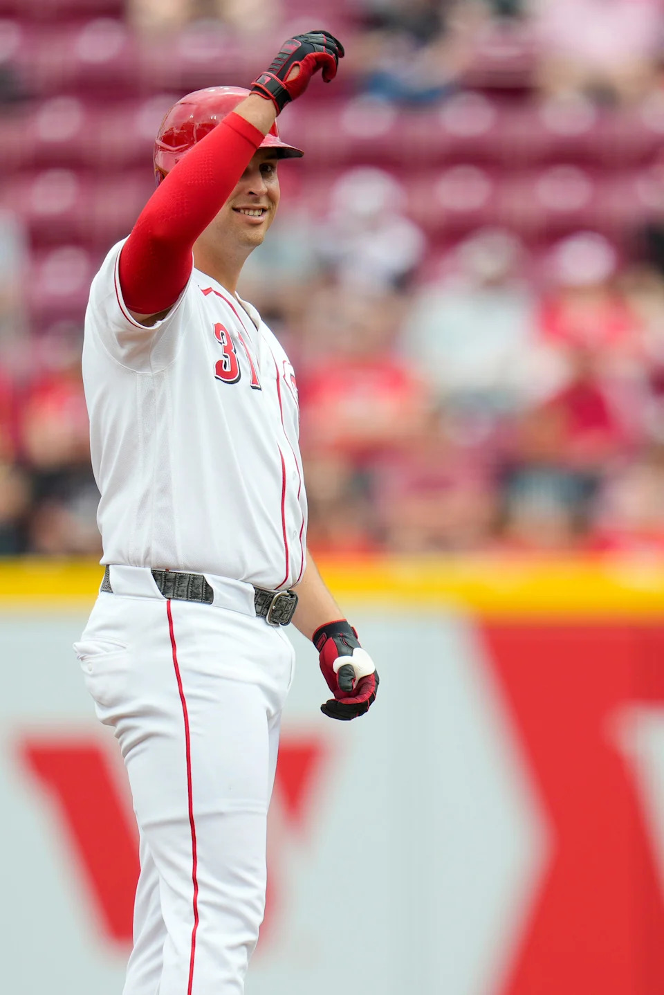 Cincinnati Reds designate hitter Nate Lowe (31) smiles from second after hitting an RBI double in the fourth inning of the MLB National League game between the Cincinnati Reds and the Pittsburgh Pirates at Great American Ball Park in downtown Cincinnati on Wednesday, April 1, 2026.
