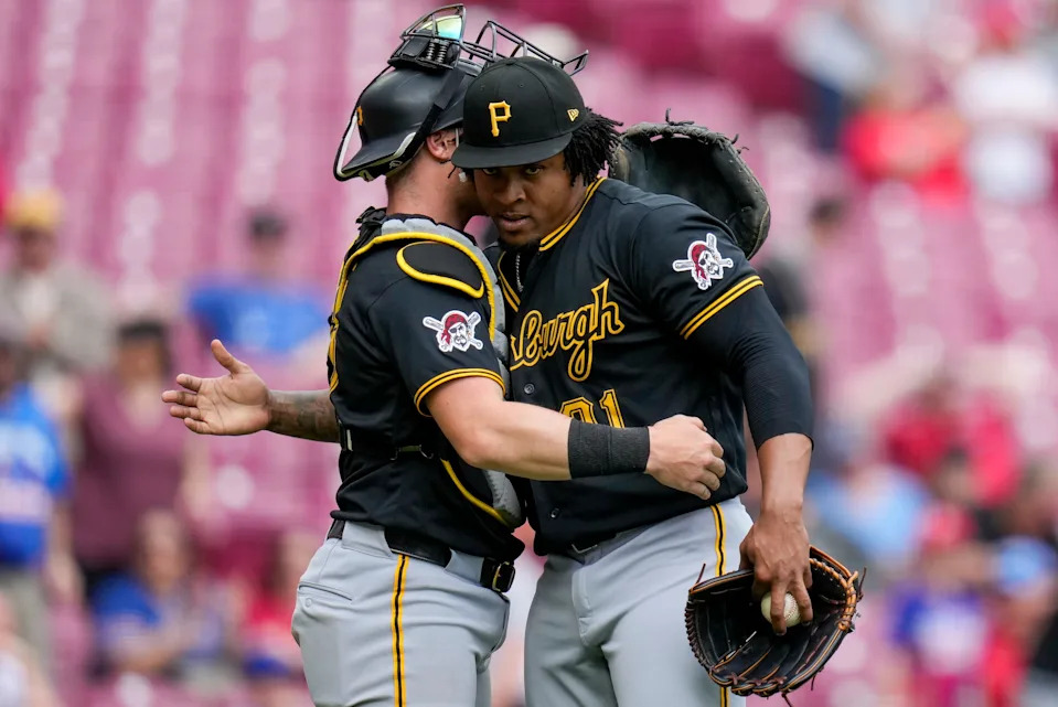 Pittsburgh Pirates pitcher Gregory Soto (31) and catcher Henry Davis (32) celebrate a win after the ninth inning of the MLB National League game between the Cincinnati Reds and the Pittsburgh Pirates at Great American Ball Park in downtown Cincinnati on Wednesday, April 1, 2026. The Reds lost 8-3.
