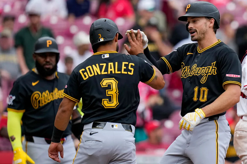 Pittsburgh Pirates right fielder Bryan Reynolds (10) celebrates a two-run home run in the ninth inning of the MLB National League game between the Cincinnati Reds and the Pittsburgh Pirates at Great American Ball Park in downtown Cincinnati on Wednesday, April 1, 2026. The Reds lost 8-3.