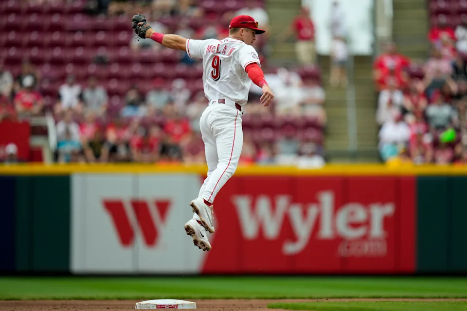 Cincinnati Reds second baseman Matt McLain (9) leaps to bring down from first baseman Sal Stewart before completing a double play in the fourth inning of the MLB National League game between the Cincinnati Reds and the Pittsburgh Pirates at Great American Ball Park in downtown Cincinnati on Wednesday, April 1, 2026.