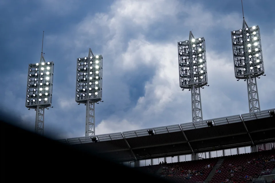 Rain clouds form over the stadium in the fourth inning of the MLB National League game between the Cincinnati Reds and the Pittsburgh Pirates at Great American Ball Park in downtown Cincinnati on Wednesday, April 1, 2026.