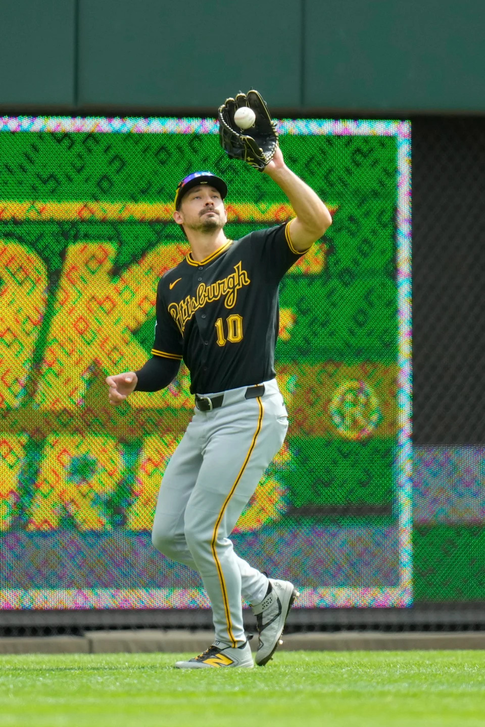 Pittsburgh Pirates right fielder Bryan Reynolds (10) catches a line drive off the bat of Nate Lowe in the second inning of the MLB National League game between the Cincinnati Reds and the Pittsburgh Pirates at Great American Ball Park in downtown Cincinnati on Wednesday, April 1, 2026.