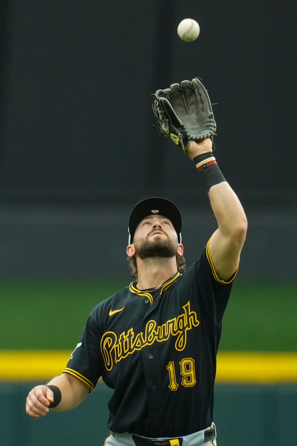 Pittsburgh Pirates shortstop Jared Triolo (19) catches a pop up off the bat of Cincinnati Reds third baseman Ke’bryan Hayes (3) in the third inning of the MLB National League game between the Cincinnati Reds and the Pittsburgh Pirates at Great American Ball Park in downtown Cincinnati on Wednesday, April 1, 2026.