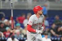 Cincinnati Reds’ Tyler Stephenson tosses his bat after hitting a solo home run during the eighth inning of a baseball game against the Miami Marlins, Monday, April 6, 2026, in Miami.