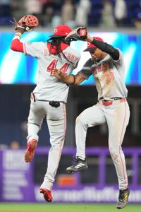 Cincinnati Reds third baseman Eugenio Suárez (28) and shortstop Elly de la Cruz (44) celebrate after the Reds defeated the Miami Marlins during the of a baseball game, Monday, April 6, 2026, in Miami.
