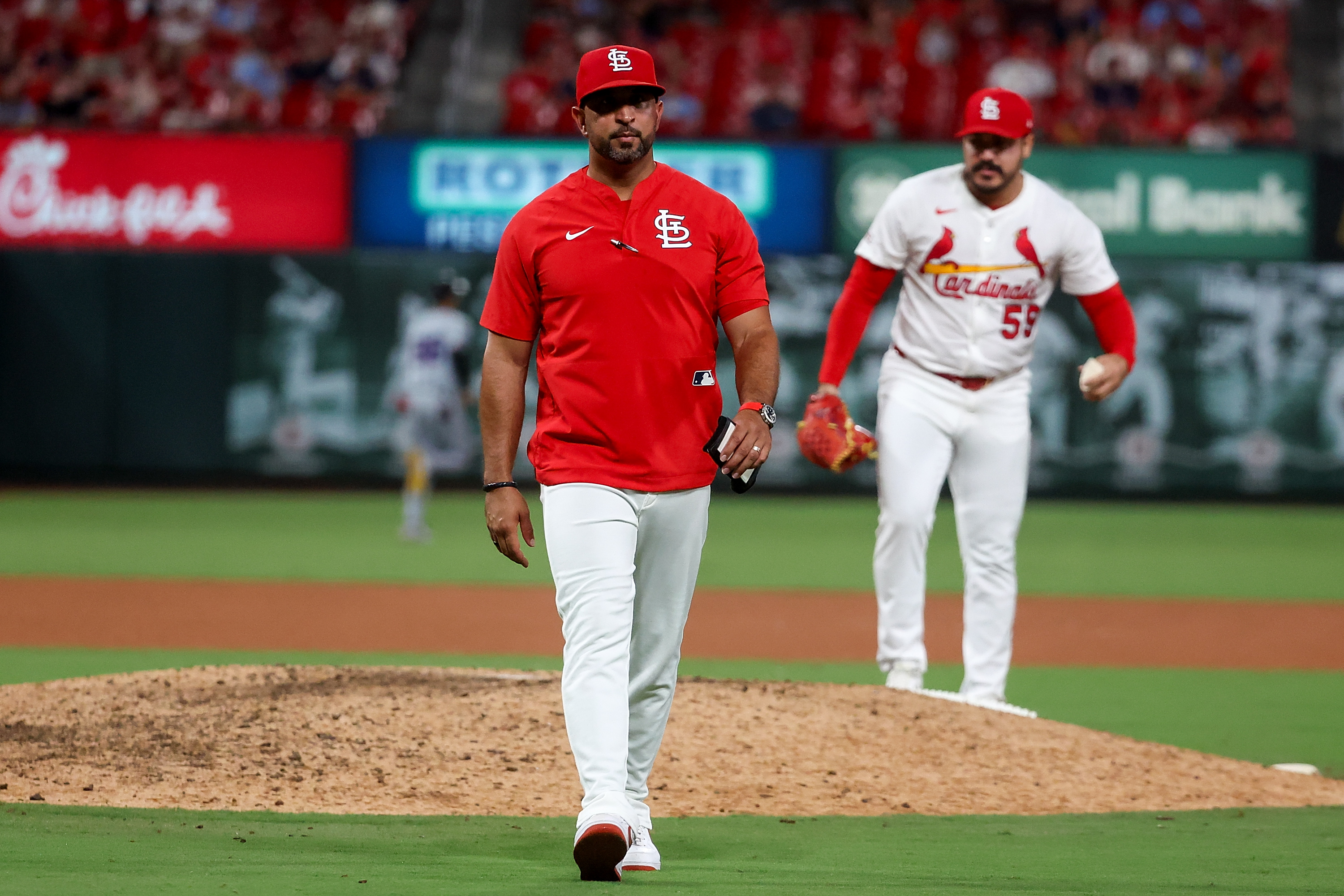 GettyOliver Marmol #37 of the St. Louis Cardinals walks to the dugout after making a pitching change during the seventh inning against the Miami Marlins at Busch Stadium on July 30, 2025 in St Louis, Missouri.