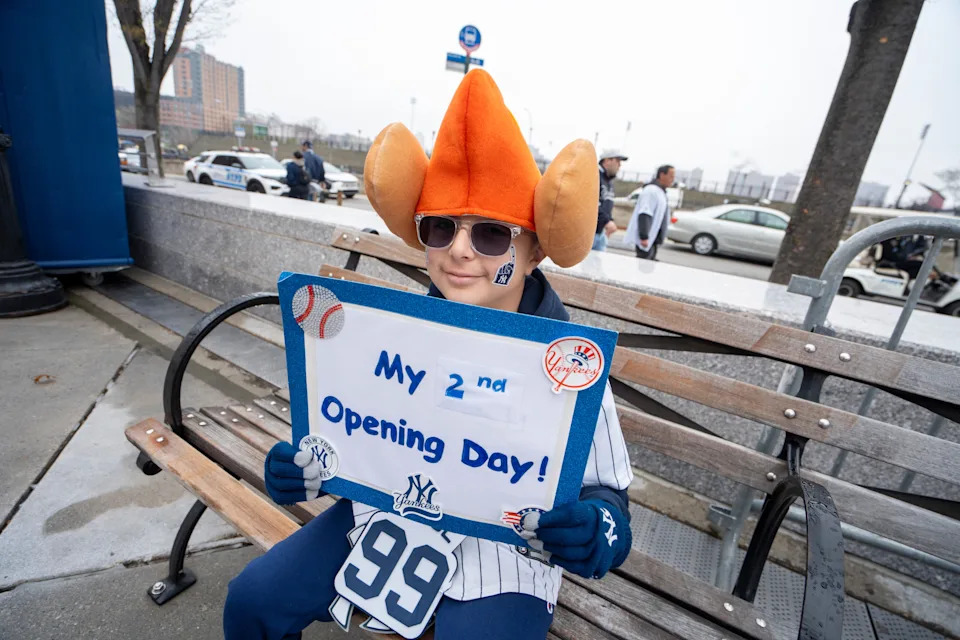 Eric Fontanez, 9, sits on a bench before his second opening day game before the home opener baseball game between the New York Yankees and Miami Marlins at Yankee Stadium in Bronx, NY, Friday, April 3, 2026.