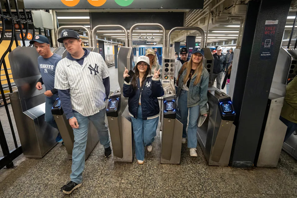 Fans exit the subway station before the home opener baseball game between the New York Yankees and Miami Marlins at Yankee Stadium in Bronx, NY, Friday, April 3, 2026.